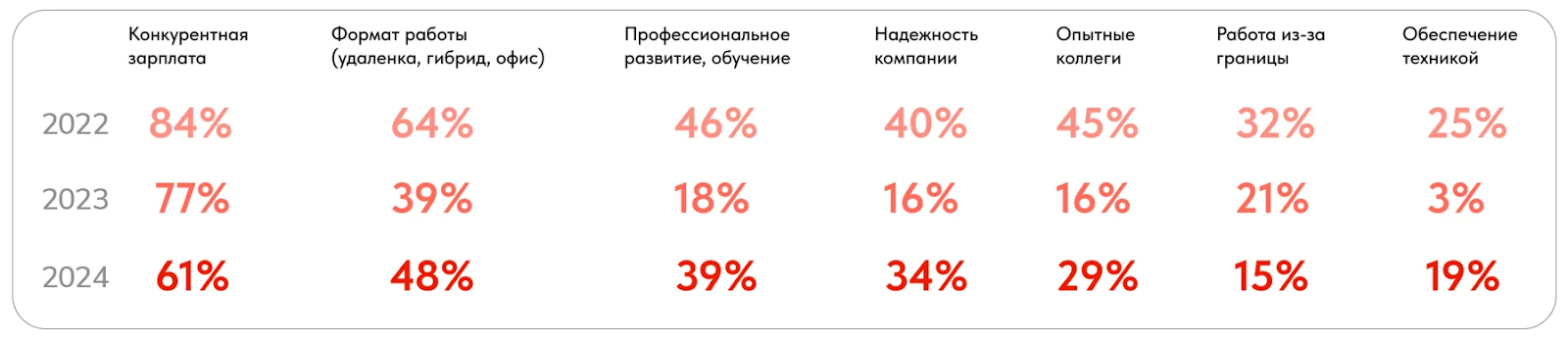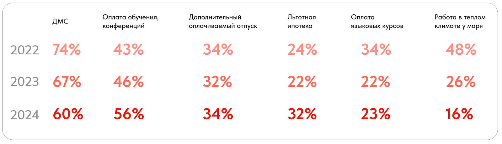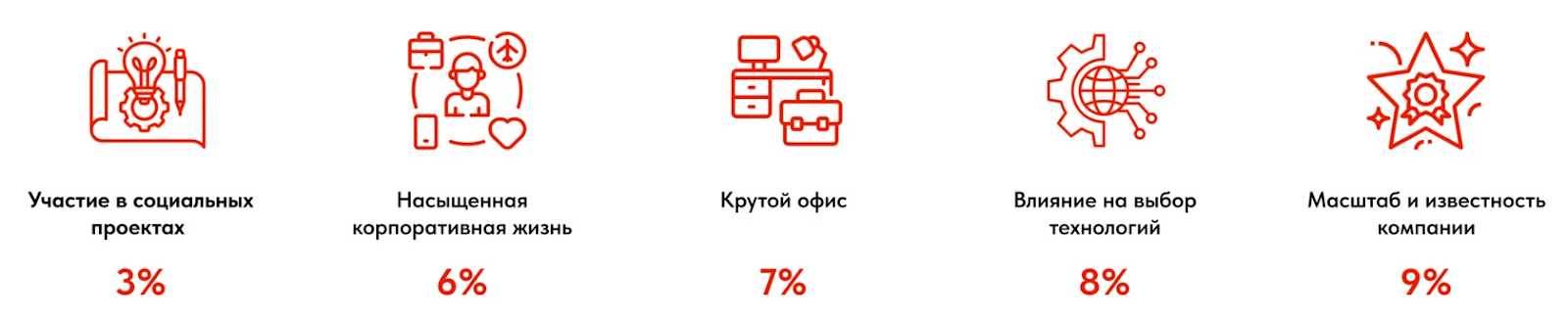 Ежегодные исследования Selecty показывают, что многие бонусы, которые казались сотрудникам важными еще 10 лет назад, больше не актуальны. Кандидатам все меньше интересен крутой офис, масштаб и известность компании, насыщенная корпоративная жизнь.